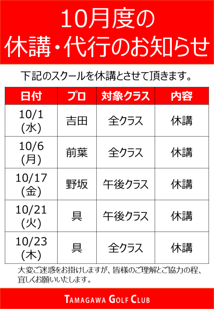 ゴルフスクール 10月度休講のお知らせ(10/4更新)