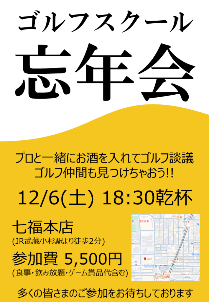トップページ > ニュース > ニュース > イベント募集 > スクールイベント募集 > 12/6(土)スクール忘年会、受付開始です!!