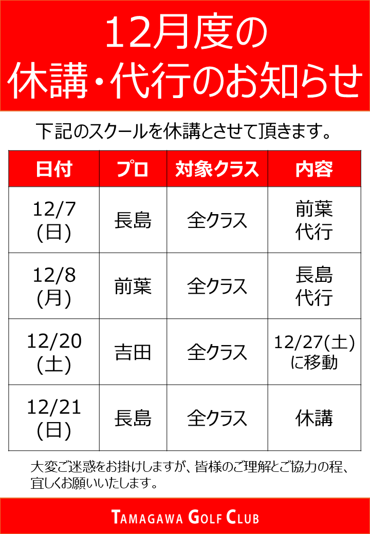 ゴルフスクール 12月度休講等のお知らせ(11/5更新)